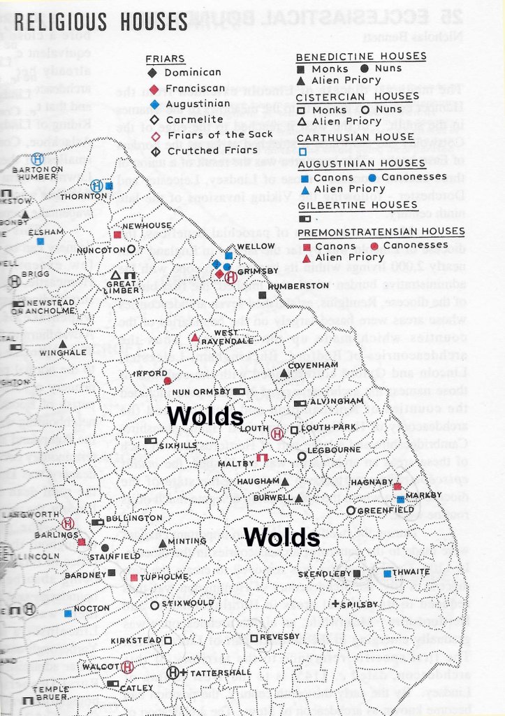 Once established monastic houses rapidly spread across England like a rash and Lindsey was one of their target areas. They took large swathes of land including consuming whole parishes. These monasteries and priories circled the Wolds giving them access to a mix of hill and marsh to exploit and make them rich. The main casualties were the long established free men, descendants of Danes, whose hard work had opened up much of the land in the preceding centuries. (See Greetham post.)