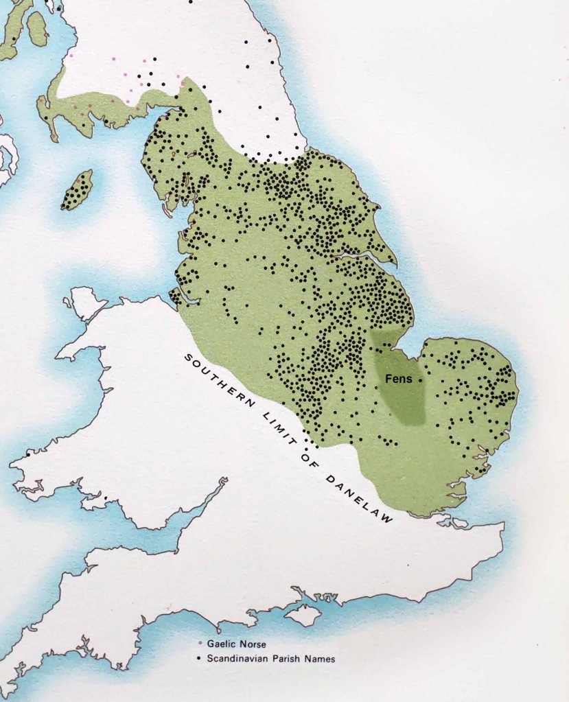 It was in Lincolnshire where Danes appear to have settled in greatest numbers and this was sometimes done in dense clusters especially along the eastern flank of the Wolds. Although clusters of villages with names ending in by have always been seen as evidence of heavy Danish settlement there are no such dense clusters to be found in Denmark itself with only the island of Oland off the coast of Sweden matching the densities found in Lindsey. The clustering of by names in Lindsey and other parts of England suggest that this was done for strategic reasons and under the direction of warlords. (Other strategic clusters can be found in Germany and Finland.) It is not only their density but also their position along main roads or near natural harbours that indicates that they were planned settlements. In east Lindsey this is evident along the Bluestone Heath Road and around Grimsby. Even the place names themselves are often repetitive with so many Ashby’s and Kirkby’s that they need to have a second name like West Ashby, Ashby by Partney and Ashby cum Fenby to differentiate between them. In the southern Wolds there were four Enderby’s, originally Eindrebi, inspired by one of Odin’s many names. They too had an extra name like Bag and Mavis and two Wood Enderby’s with in time the more eastern changing to Woodthorpe to stop further confusion.