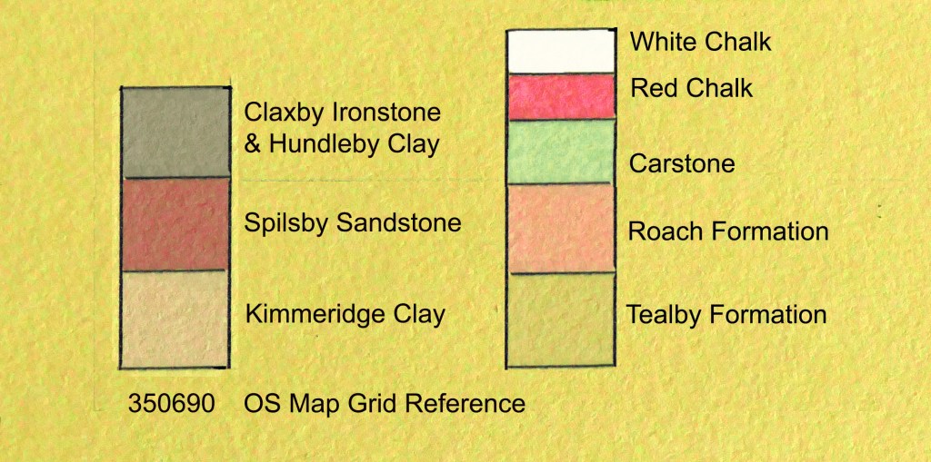 The following series of profiles are cross-sections of Snipe Dales and its beck down to and including the River Lymn. They show how although the band of Spilsby Sandstone is only around ten metres thick, with it dipping gently from southwest to northeast, it continues the length of the dale from Winceby to Sausthorpe where even then it continues as a plateau right up to the base of Langton Edge. This combination of geography and geology allows this narrow band of porous rock to impose its influence on much of the South Wolds especially with it overlaying a thick impermeable layer of Kimmeridge Clay creating a long and incised spring line between the dry plateau overlying the damp clay valleys. This produces a landscape of many small streams, often emerging in boggy depressions overlooked by scrubby bands of gorse, flowing into the meandering Snipe Dales Beck hidden among alders overlooked by hamlets with small sandstone churches. (See The Distribution and Geology of the Carr Dales post.)