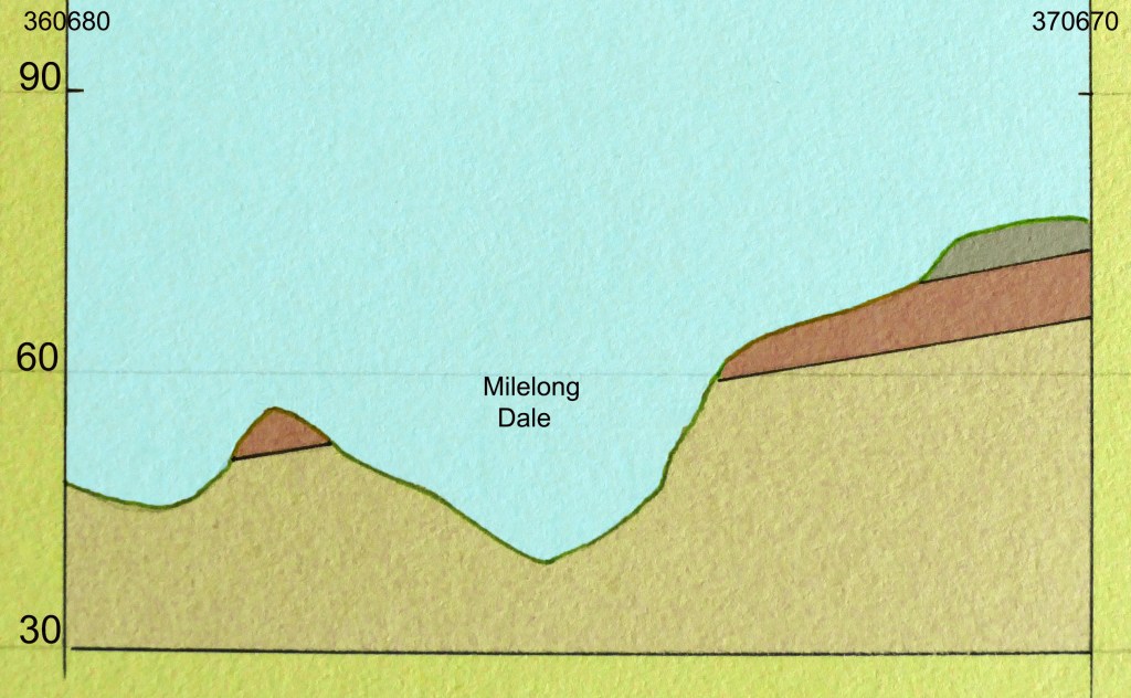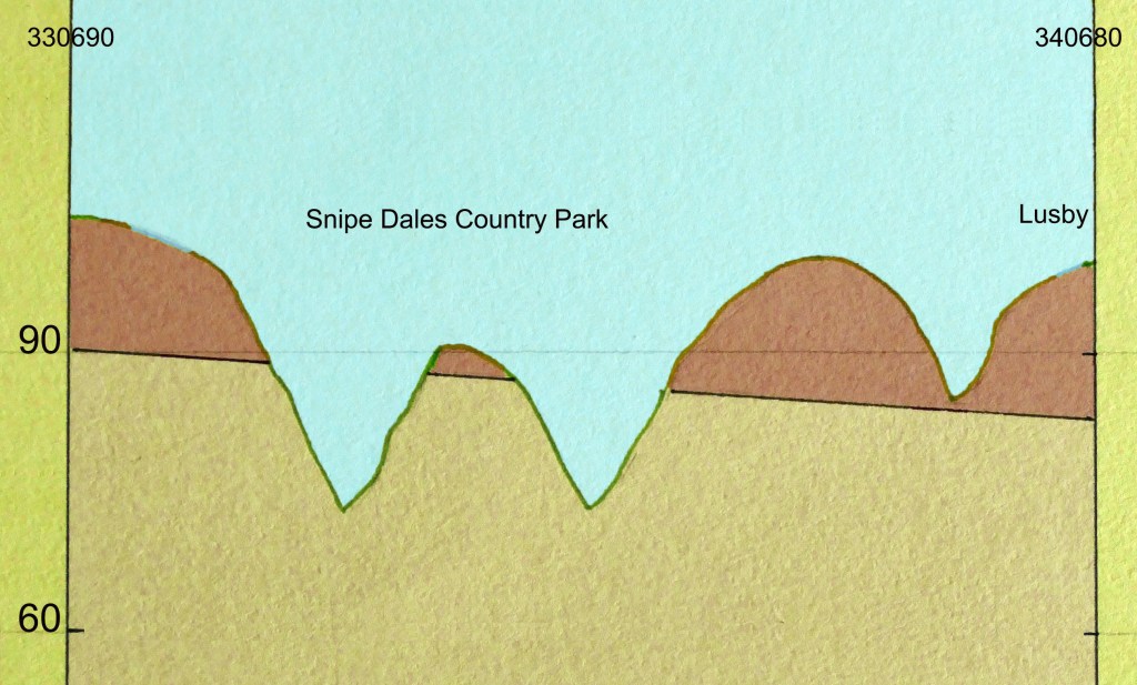 Here this diagonal crosses back over the dale by a particularly undulating line crossing three narrow valleys in just over a kilometre ending up close to Lusby. The first two valleys are accessible as they are part of Snipe Dales Country Park and the third is visible from the footpath that follows Snipe Dales Beck from the park east to Lusby Lane. The profile finishes near the top of the hill and edge of the village.