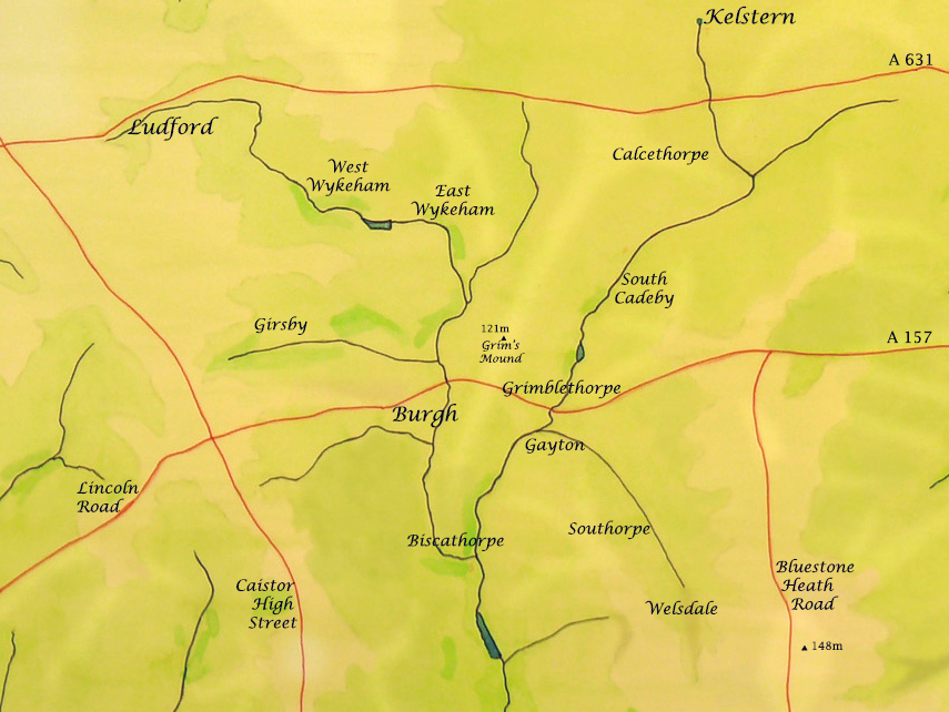 The word thorpe is originally Danish and is most frequently associated with a small secondary settlement. The Danes settled in large numbers across Lindsey and particularly in the Wolds and a thousand years ago the upper Bain Basin was more heavily settled than it is now. Like with Biscathorpe many of these settlements were eventually abandoned. Some had the suffix thorpe but most were by definition thorpes and on the map they have all been included but written in a slightly smaller font than the larger villages. Yet at the time of the Domesday Book Girsby and Gayton were the most populous villages and Burgh was an abandoned settlement.
