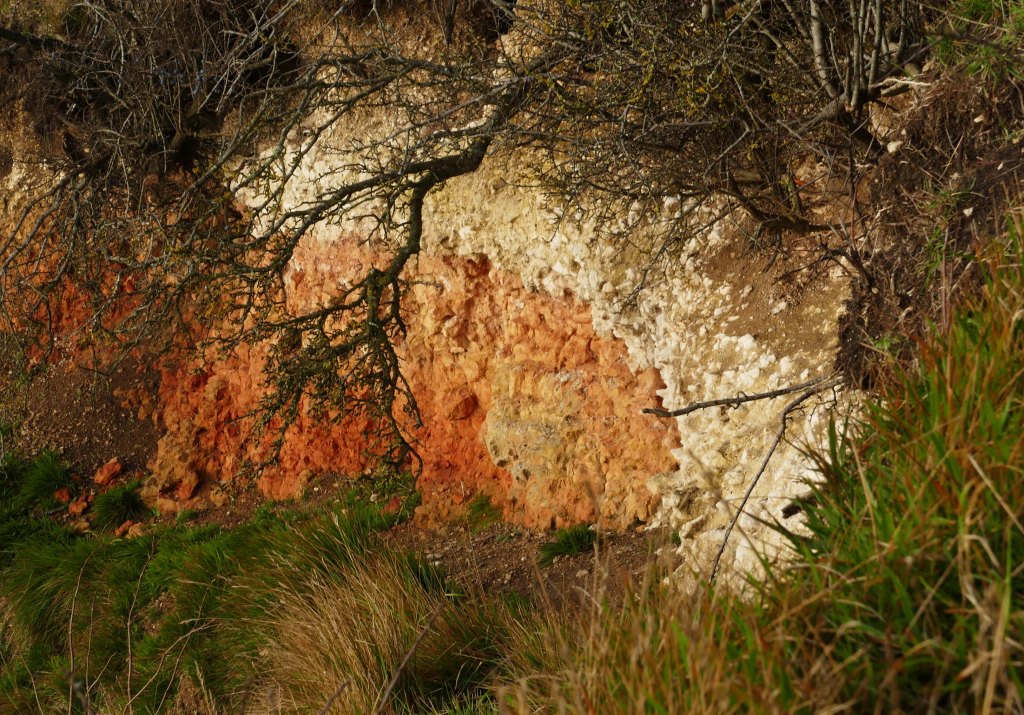 These pockets of contrasting habitats are down largely to the different bands of rock that Red Hill lane passes over from the Bluestone Heath Road down to Goulceby. From the Upper Cretaceous white chalk topping Red Hill it is just two kilometres down to the Kimmeridge Clay of the Jurassic period making this locale not only unrivalled in the area for such a diversity of rock types but has the advantage of being easily accessible. The lane crosses over white chalk, red chalk, Carstone, Roach Stone, Tealby Formations, Claxby Ironstone, Spilsby Sandstone and Kimmeridge Clay. Although the strata between the chalk and sandstone are not noticeable here this changes a few kilometres further south where each rock caps hills in different locations with the exception of the Tealby Clay that fills the valleys in between. As with the Tealby Formations, these individual strata are not uniform but can contain within them soft clay, loose sand and pebbles, and solid rock adding to the irregular nature of the landscape in contrast to the much more uniform chalk beds further north and east on the Wolds.