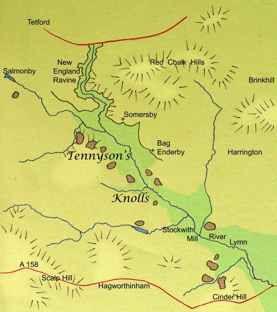 The small isolated sandstone hill just referred to may be a subtle feature in the landscape, but it is just one of a good number of similar hills, never much over sixty metres asl, which overlook the River Lymn stretching from Salmonby southeast as far as the A158. The most prominent, however, are those that lie directly opposite Somersby and are immortalised in Tennyson’s most admired poem, In Memoriam AHH. Here he remembers one benign summer’s evening looking across from the garden of the rectory, where he spent the majority of his first twenty-eight years, and describes it thus –
